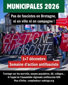 Municipales 2026 : Pas de fascistes en Bretagne, ni en ville ni en campagneLa 1ere semaine de dĂ©cembre, on occupe le terrain face aux fascistes!Le RN et d’autres partis fascistes ont annoncĂ© leur intention de profiter des municipales pour tenter de s’implanter dans de nombreuses… Lire la suite : 1>7 dĂ©cembre : semaine d’action antifasciste !