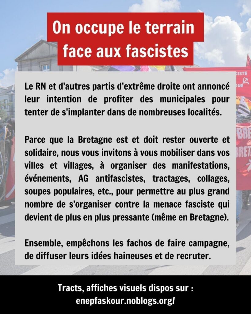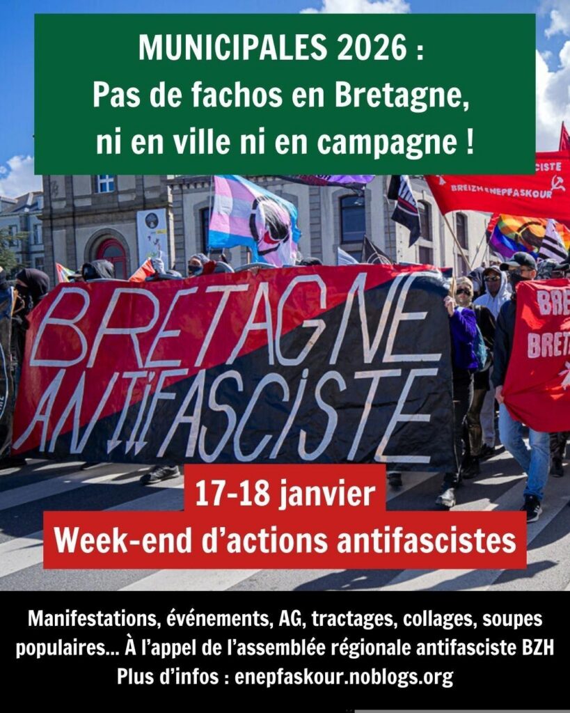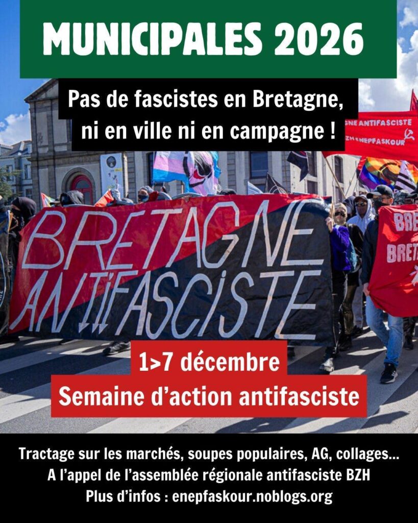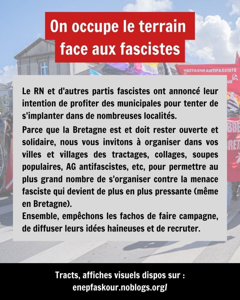 Le RN et d’autres partis fascistes ont annoncé leur intention de profiter des municipales pour tenter de s’implanter dans de nombreuses localités. Parce que la Bretagne est et doit rester ouverte et solidaire, nous vous invitons à organiser des tractages, soupes populaires, collages, AG antifascistes, etc, pour permettre au plus grand nombre de s’organiser contre la menace fasciste qui devient de plus en plus pressante (même en Bretagne). Ensemble, empêchons les fachos de faire campagne, de diffuser leurs idées haineuses et de recruter.