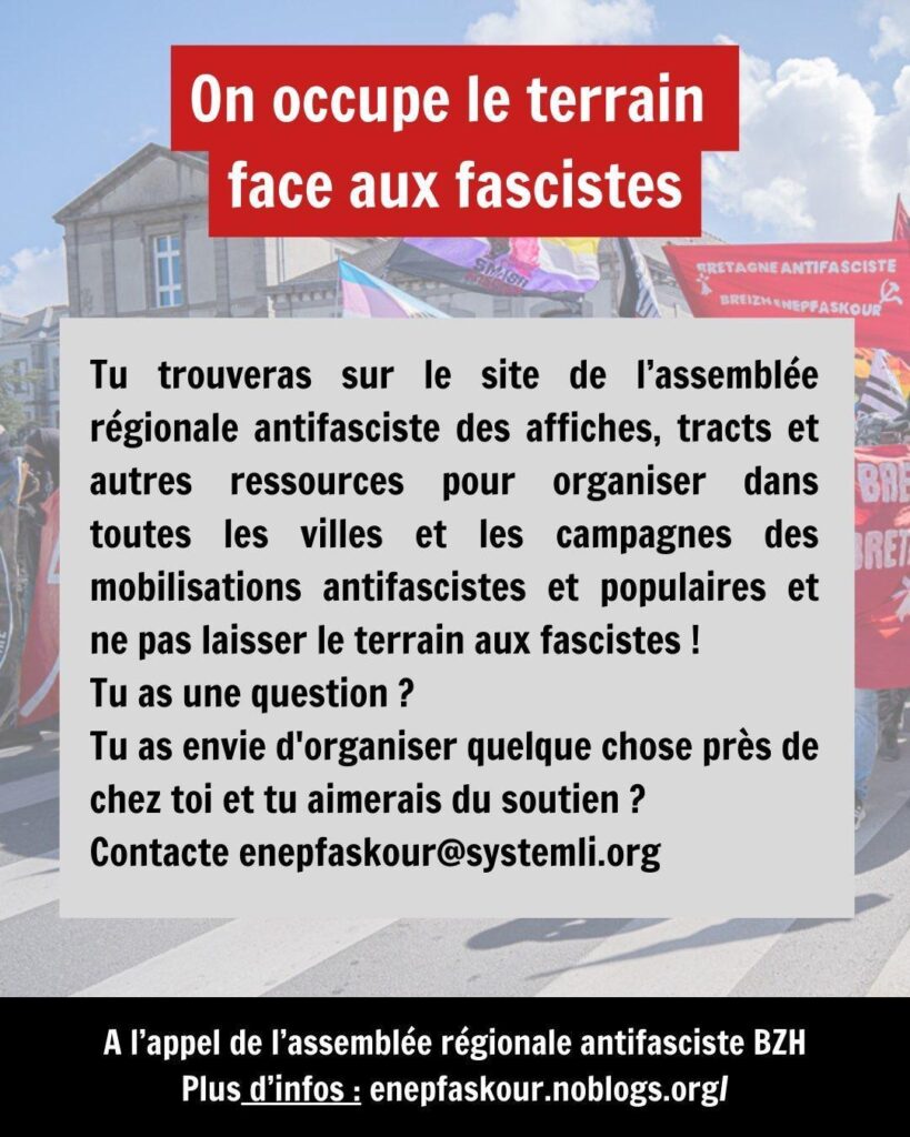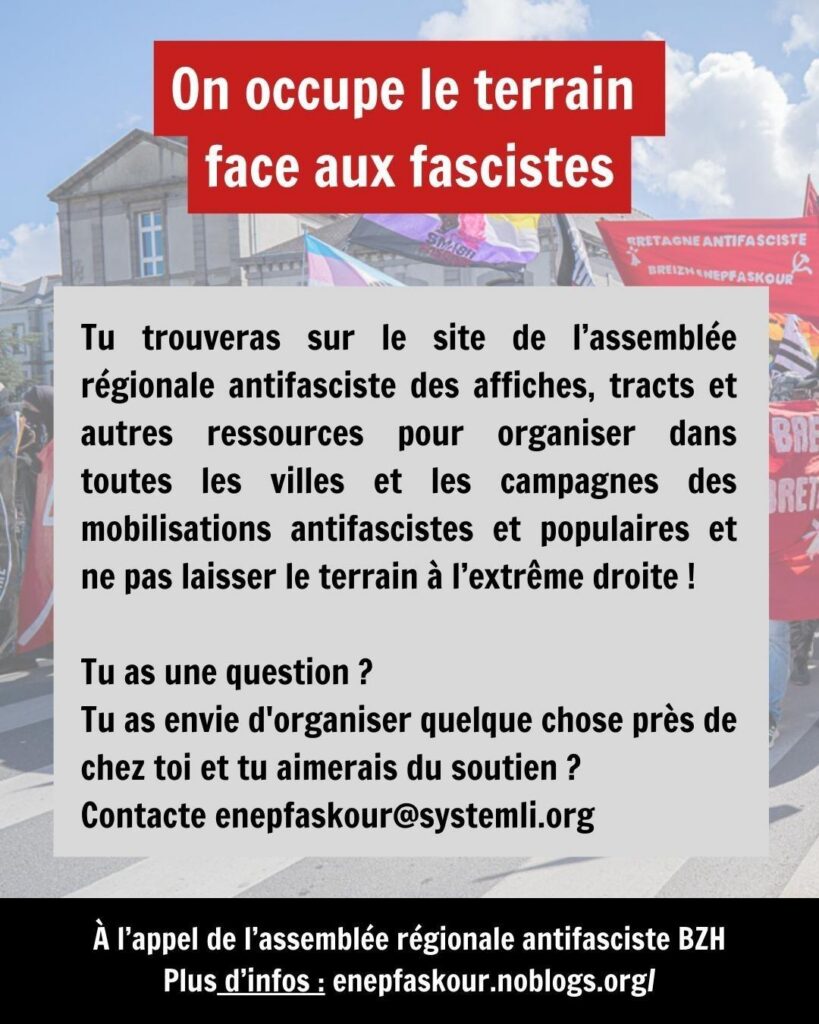 Parce que la Bretagne est et doit rester ouverte et solidaire, nous vous invitons à organiser des tractages, soupes populaires, collages, AG antifascistes, etc, pour permettre au plus grand nombre de s’organiser contre la menace fasciste qui devient de plus en plus pressante (même en Bretagne).